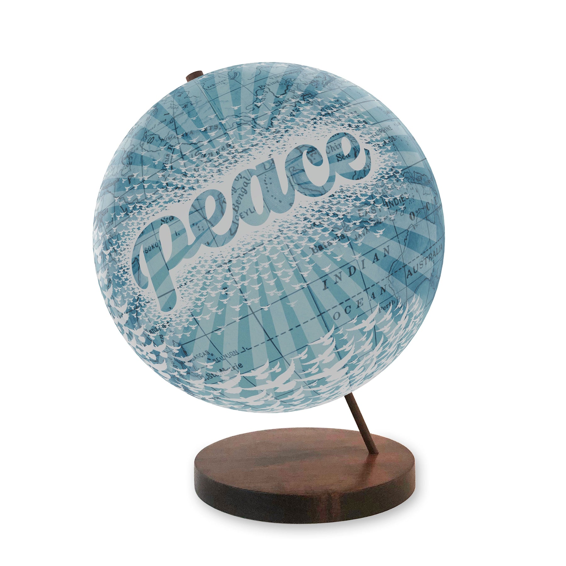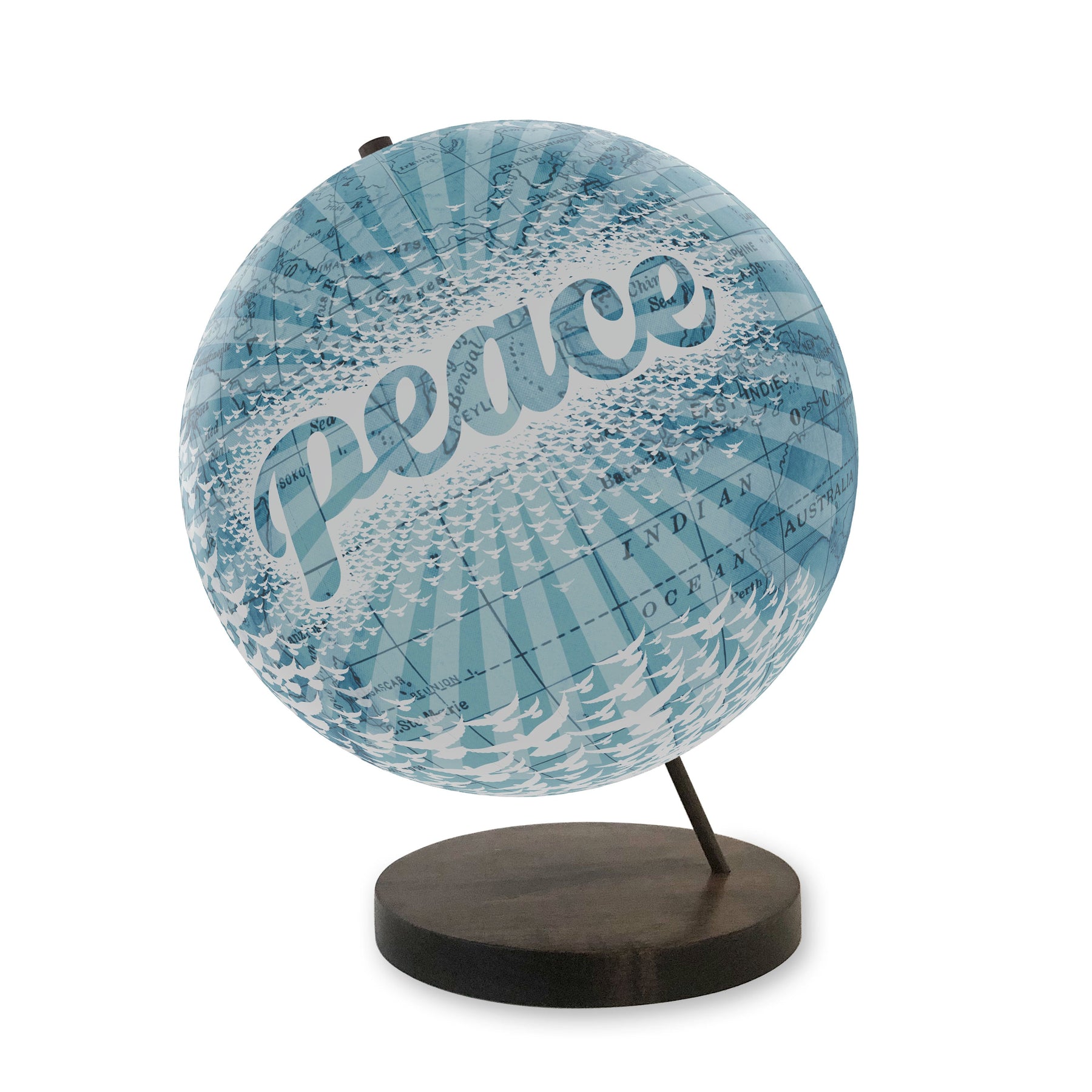 Our Peace on Earth Globe features hundreds of graceful white doves soaring around a beautiful blue vintage world map, symbolizing unity and hope.