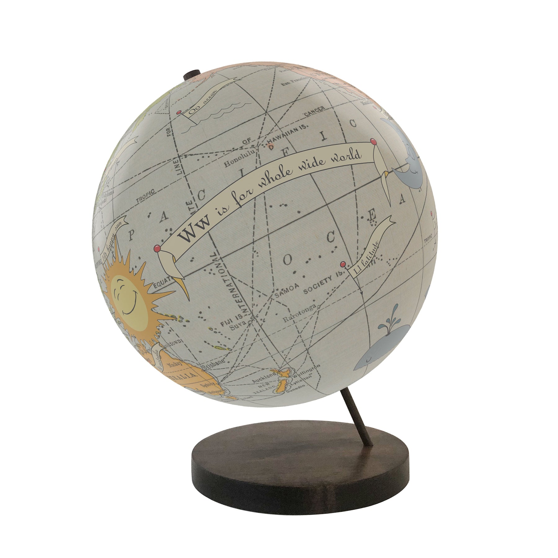 The W is for Whole Wide World globe is a dreamy nursery keepsake featuring a pastel ABC-themed vintage world map with whimsical touches of rainbows, clouds, the sun, and moon.